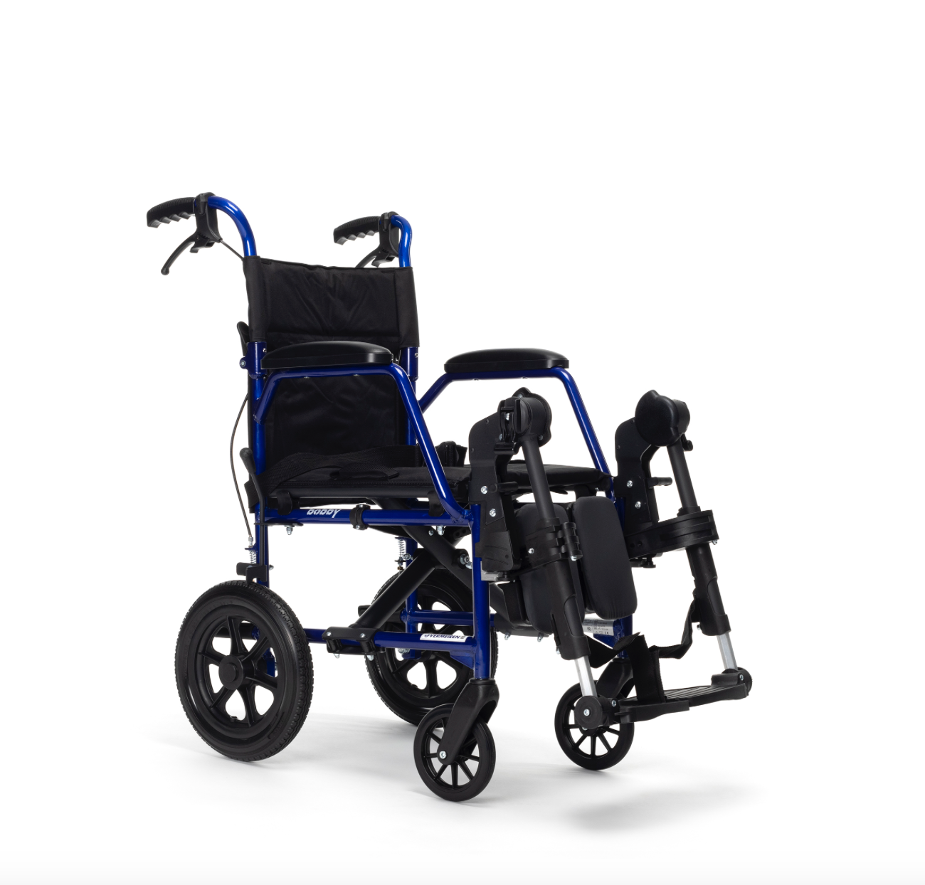 Le dispositif de mobilité équipé de deux grandes roues arrière et de petites roues avant, permettant de se déplacer en le propulsant lui-même avec les mains ou grâce à une aide extérieure.